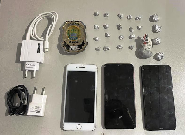 No momento do cumprimento do mandado contra ele, o adolescente se encontrava em uma residência que estava sendo utilizada como ponto de tráfico de drogas. Foram apreendidas porções de crack e maconha, além de três aparelhos celulares.