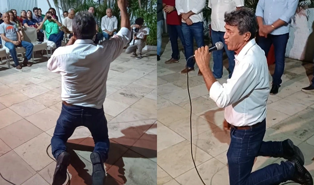“Abraçou a ideia de juntar as forças de todos nós para que nós pudéssemos chegar e ter esse momento histórico, chegar o José Hamilton, grande ídolo da política parnaibana e fazer com que ele viesse ser nosso padrinho e possivelmente ser nosso pré-candidato em Parnaíba”, disse de joelhos.